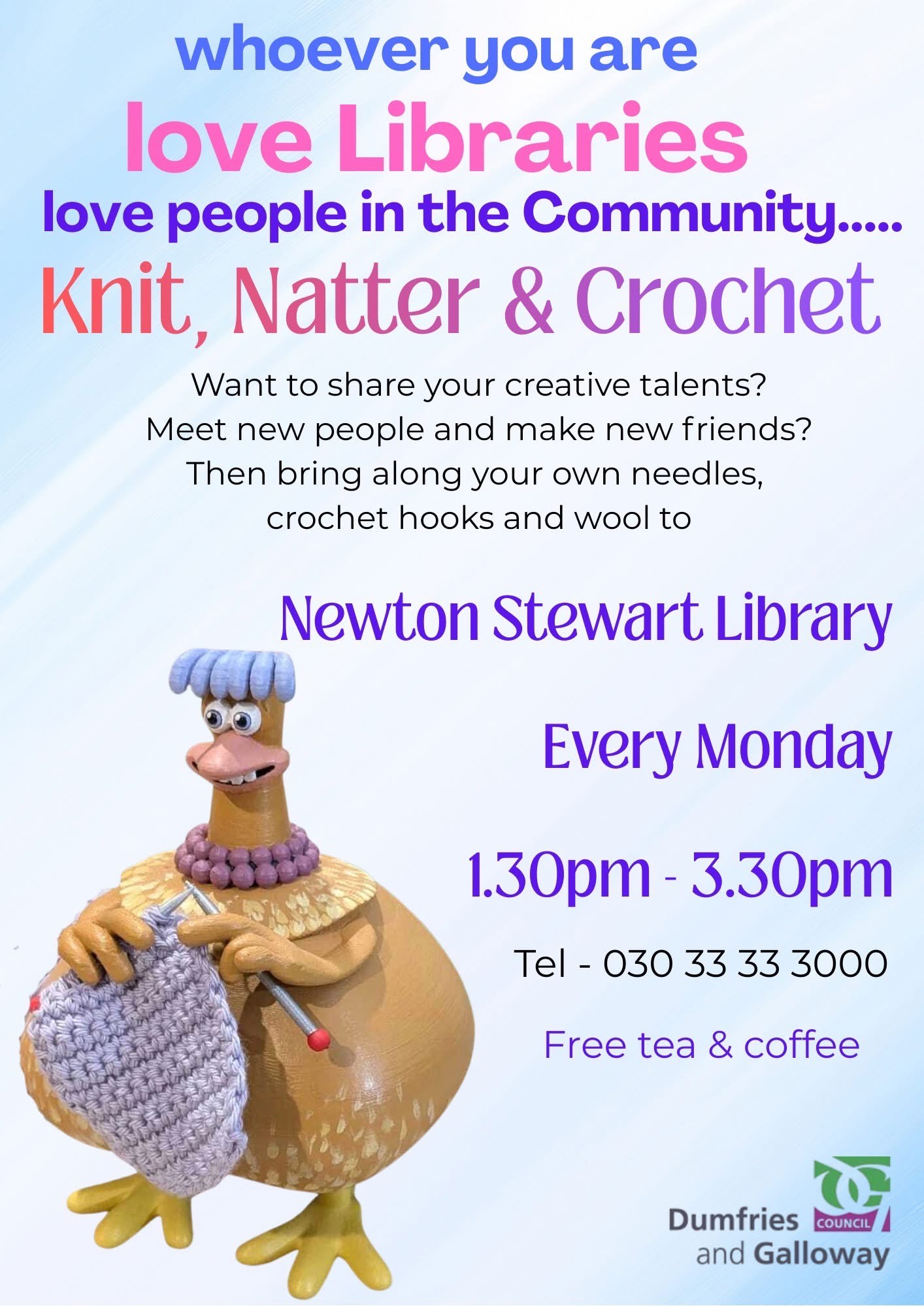 bring along your needles, crochet and wool to Newton Stewart library