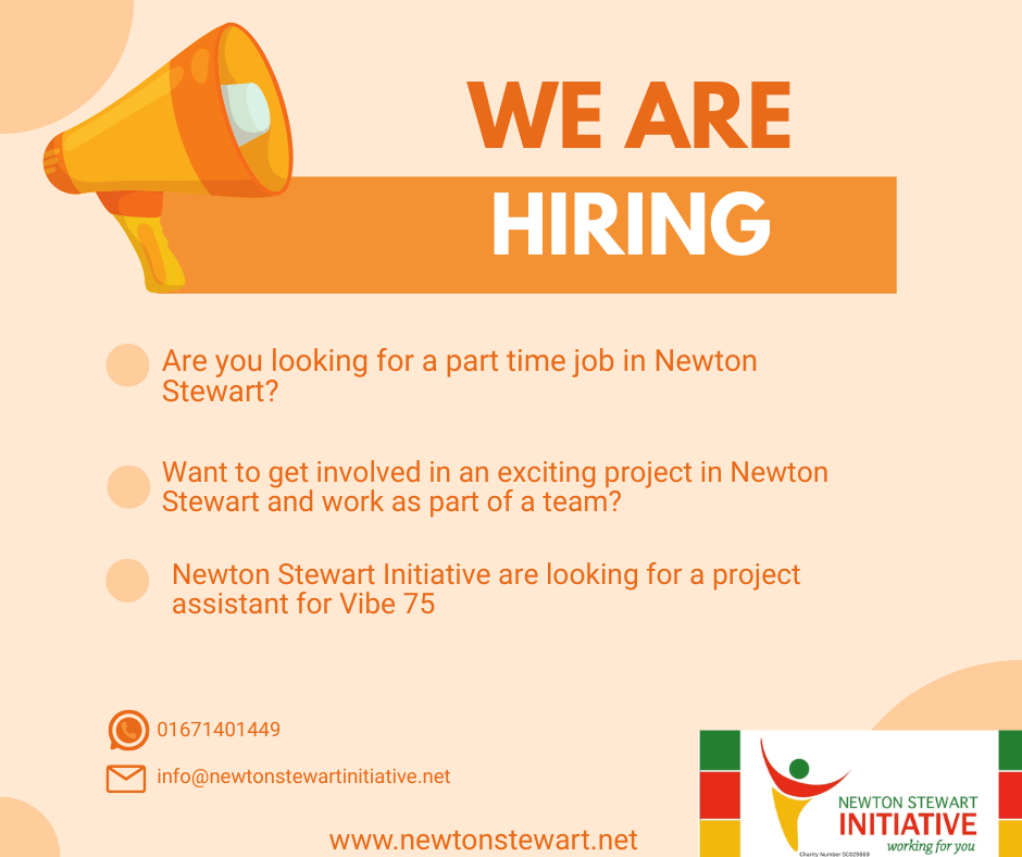 Newton Stewart Initiative are looking to employ a part time project worker to help develop Vibe 75 into an inclusive community facility incorporating youth work, in partnership with Dumfries and Galloway Council Youth Work Team, and a Community Space suitable for use by community groups and other local organisations.
